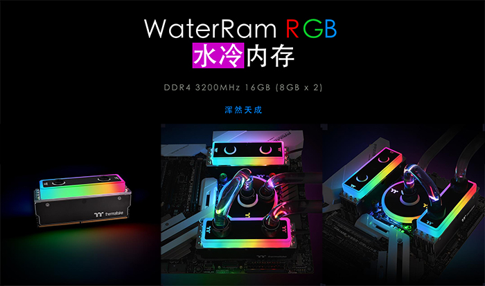 曜越科技(Thermaltake)在CES 2019上正式公布了自己的首款内存产品——曜越WaterRAM。它直接集成了水冷模块,两个G 1/4标准接头,可兼容绝大多数水冷系统,同时还有2毫米厚的铝质散热片,综合起来可将内存温度降低最多37%。水冷模块上有addressable RGB LED灯条,支持多达1680万色,兼容多品牌灯效系统。核心规格方面,采用了SK海力士的内存颗粒,单条容量8GB,标准频率3200MHz。