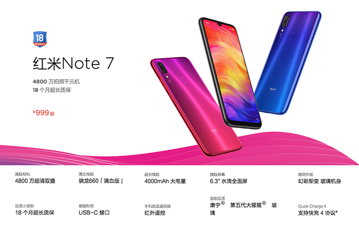 1月10日,全新独立品牌红米Redmi新品发布会在北京举行,正式发布红米Note 7。提供暮光金、梦幻蓝、亮黑三种配,3GB+32GB版售价999元,4GB+64GB版售价1199元,6GB+64GB版售价1399元。该机采用6.3英寸水滴屏,搭载满血版高通骁龙660处理器,CPU主频高达2.2GHz,配备4000mAh大电池,支持QC 4充电协议,后置4800万像素超清相机,标配Type-C接口并保留了3.5mm耳机孔。