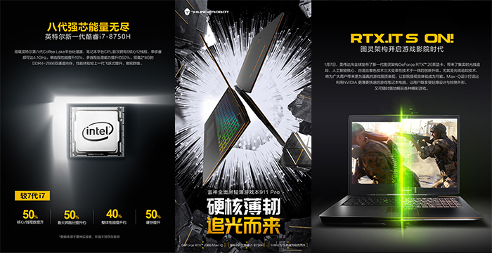 1月14日,雷神在京举办2019年新品发布会,重磅推出全新顶级游戏本“追光者911 Pro”, 售价11999元起。雷神称,这也是业内第一款采用3.5毫米转轴的15.6寸笔记本。IPS材质的电竞屏幕分辨率为1080p,刷新率144Hz,响应时间最短3ms。标配Intel酷睿i7-8750H处理器、16GB DDR4内存、M.2 NVMe PCI-E 3.0 x4固态硬盘、Intel AC9560双频双通道无线网卡。风洞散热三维环流系统设计了6个出风口,内置六根加长纯铜热管,以及两个71片扇叶的风扇。接口有USB 3.0、SD读卡器、3.5mm耳麦一体等。