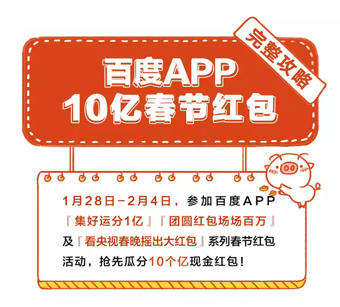 1月27日,百度官方放出了春晚红包互动环节的完整攻略。春节红包最早将在1月28日开抢,届时百度将开放“集好运”和“团圆红包”两个主题活动给大家预热尝鲜,一直到2月4日除夕结束。“集好运”活动,集齐全部10张好运卡即可获得瓜分1亿元。更有24K限量金猪、爱奇艺年卡等奖品。“团圆红包”需要邀请好友组队完成,最高可以瓜分200万。2月4日除夕,用户可以打开百度App根据春晚主持人的口播进行操作,来瓜分9亿红包,红包互动共分为4轮进行。除了百度App之外,使用百度旗下的好看视频、百度贴吧、百度地图等产品也都可以参与到活动中来。