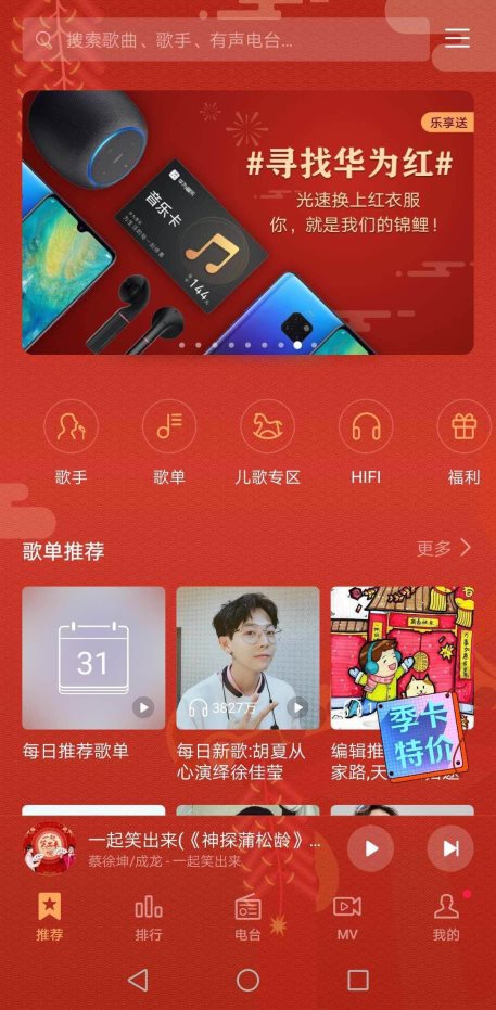 其实,真正的“华为红”不仅露于产品表面,还藏于“内”——细心的用户不难发现华为音乐已上新了充满节日气息的“新春快乐”皮肤。1月31日-2月3日期间,凡换上华为音乐“新春快乐”皮肤的用户,在“寻找华为红,我要成锦鲤”的话题圈中分享新年新意,晒出皮肤即有机会成为华为音乐专属锦鲤,获得由HUAWEI Mate 20、HUAWEI FreeBuds 2无线耳机、华为AI音箱、华为音乐VIP年卡、音乐惊喜周边等优质好礼组成的锦鲤大礼包,总价值高达8000元,只为独宠你一人。