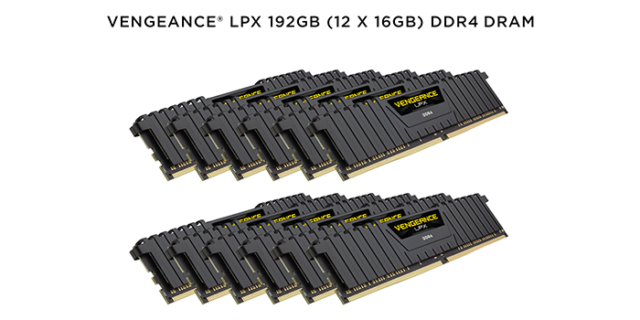 海盗船为Intel 28核心发布了专供的复仇者Vengeance LPX 192GB内存套装,由多达12条16GB内存组成,可完美兼容并开启六通道模式。该套装提供了四种选择,频率分别为2666MHz、3200MHz、3600MHz、4000MHz,其中第一款电压为1.20V,其他均为1.35V。所有内存都有阳极氧化铝材质的全覆盖散热片,同时海盗船还提供了额外的主动风扇,可加装在内存条之上,辅助散热。四种规格售价分别为1585、1720、2320、3000美元,约合人民币1.07万、1.16万、1.57万、2.03万元。