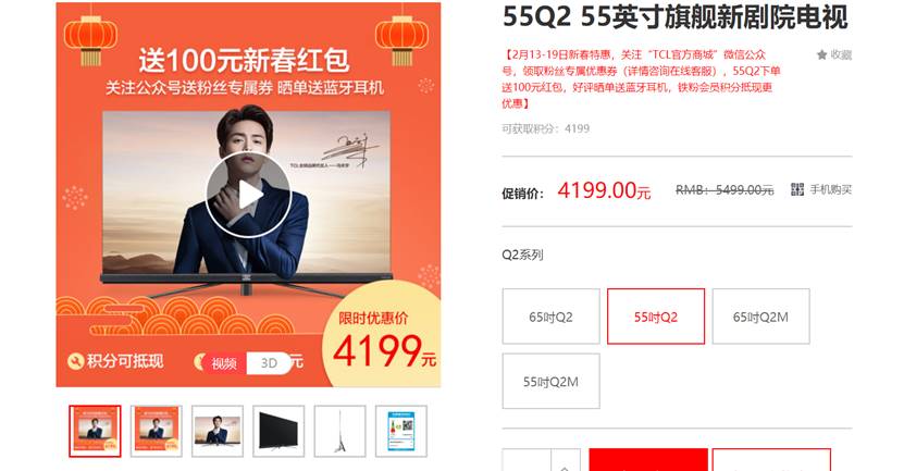 TCL 55Q2电视正在TCL官网商城热卖中,限时优惠价4199元,抢到就是赚到。