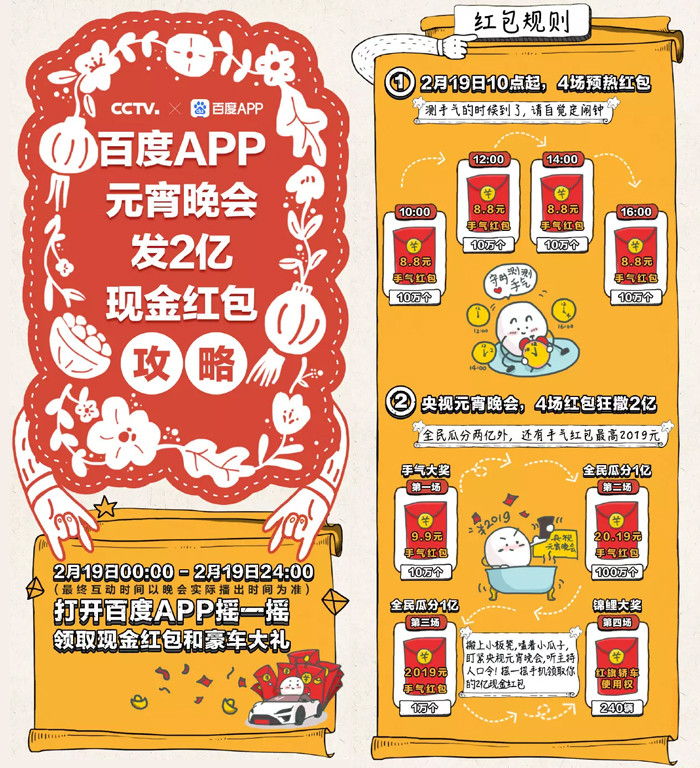 元宵佳节将至,央视元宵晚会即将上演,百度元宵红包来了。具体规则:1、2月19日10点、12点、14点、16点四个整点时刻,四场预热红包,各有10万个8.8元手气红包,总额352万元。2、央视元宵晚会期间(19日晚20点06分开始),四场红包狂撒2亿元,其中第一场10万个9.9元手气红包,第二场100万个20.19元手气红包,第三场1万个2019元手气红包,第四场240辆红旗轿车使用权。