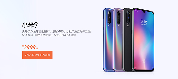 小米9采用6.39英寸屏幕,骁龙855处理器,第五代屏幕指纹解锁,提供全息幻彩蓝和全息幻彩紫以及深空灰三种配色。6+128GB起售价格为2999元。8+128GB售价3299元。