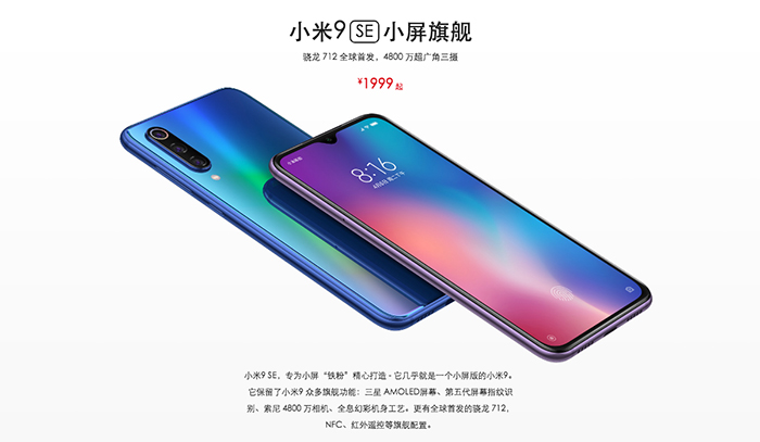 小米9 SE采用5.97英寸水滴屏屏幕,搭载全球首发的骁龙712处理器,后置索尼4800万像素主摄加持的三摄拍照。6+64GB版本售价1999元,6+128GB版本售价2299元。