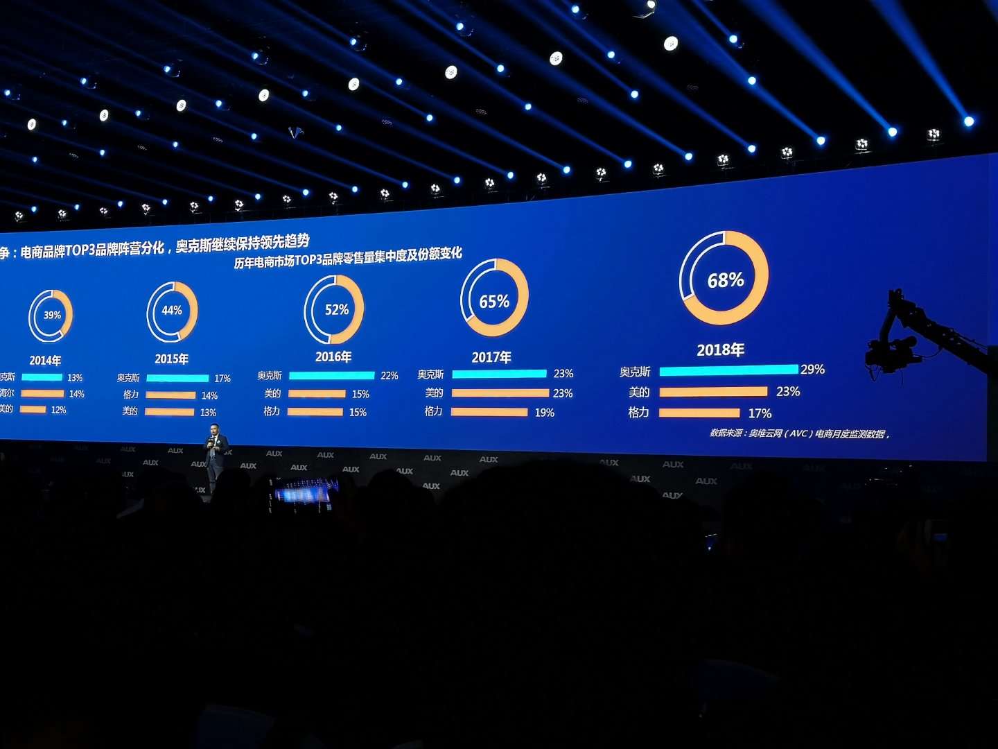 现场奥克斯PPT公布数据显示:就2018年品牌零售量份额数据显示奥克斯占比29%,美的占份额23%,而格力占份额只有17%;