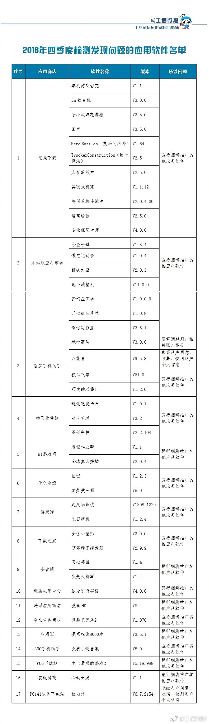 【小熊在线网 新闻报道】据@工信微报 消息,工信部日前发布的通告显示,2018年第四季度组织对47家手机应用商店的应用软件进行技术检测,发现违规软件4 ......