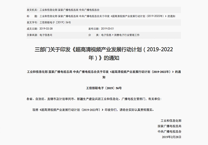 3月1日,工业和信息化部、国家广播电视总局、中央广播电视总台印发《超高清视频产业发展行动计划(2019-2022年)》,将按照“4K先行、兼顾8K”的总体技术路线,大力推进超高清视频产业发展和相关领域的应用,同时加强4K/8K显示面板创新,发展高精密光学镜头等关键配套器件。计划到2020年,4K摄像机、监视器、切换台等采编播专用设备形成产业化能力;建立较为完善的超高清视频产业标准体系;中央广播电视总台和有条件的地方电视台开办4K频道。到2022年,我国超高清视频产业总体规模超过4万亿元,4K产业生态体系基本完善,8K关键技术产品研发和产业化取得突破,形成一批具有国际竞争力的企业。