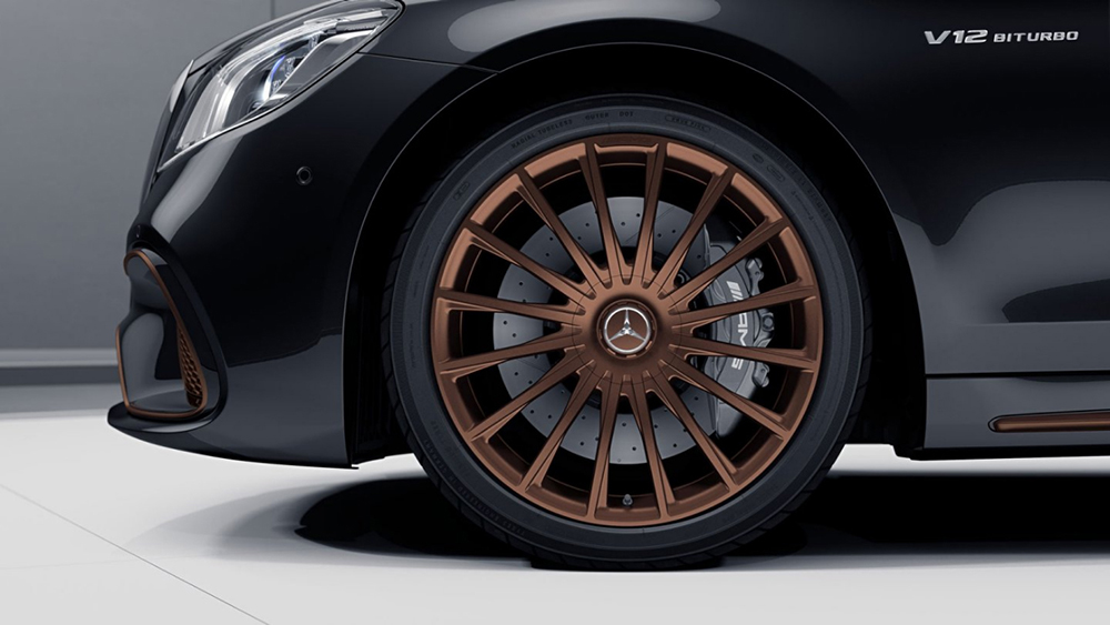 外观方面,该车依旧延续现有车型设计,主要针对细节处进行调整。采用高光黑色漆面、20英寸多辐轮圈,并在侧裙、轮圈、前包围处加入铜色元素修饰,C柱处的AMG标志强调其特殊身份。另外,该车采用高亮黑色的排气装饰。