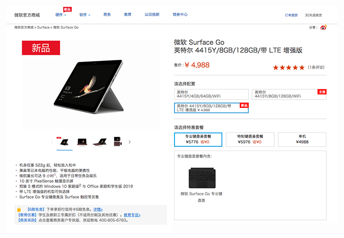 3月4日,微软中国宣布,Surface Go LTE版即日起在中国市场正式发售,起售价为4988元。Surface Go LTE版全面支持三大运营商服务,只需插入SIM卡就可轻松使用。整体厚度为8.3毫米,重量532克,屏幕为10英寸PixelSense触摸显示屏,支持倾斜输入、配有4096级压感的Surface触控笔。搭载英特尔金牌处理器4415Y,无风扇设计,8GB内存+128GB存储,电池续航时间长达8.5小时,内置支架可调节至165度,预装S模式的Windows 10家庭版与Office家庭学生版2019。