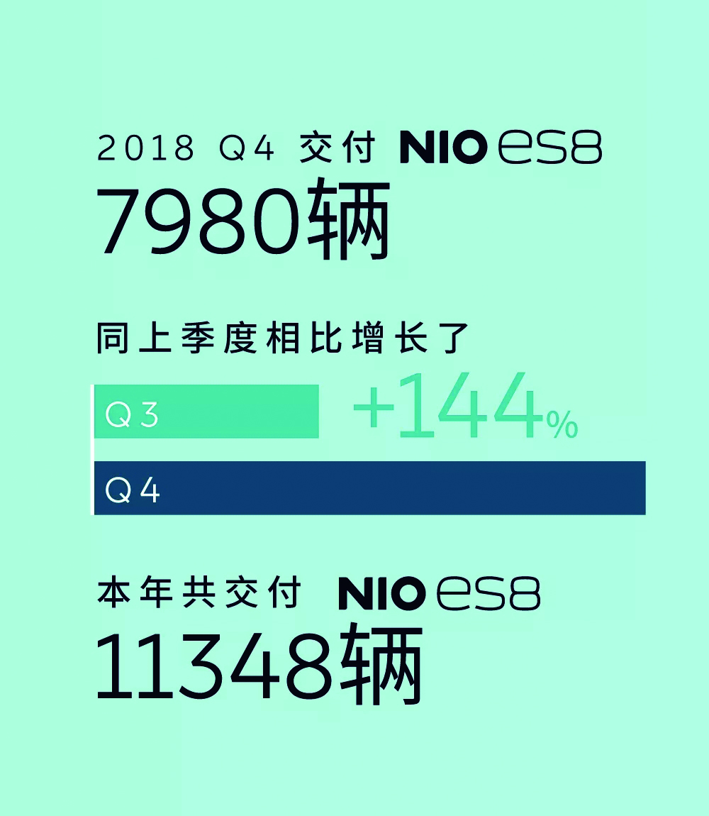第四季度ES8产量为8069辆,比第三季度的4206辆增长92%;2018年全年ES8产量达到12775辆。第四季度ES8交付量为7980辆,高于第三季度的3268辆;2018年全年ES8交付量达到11348辆。