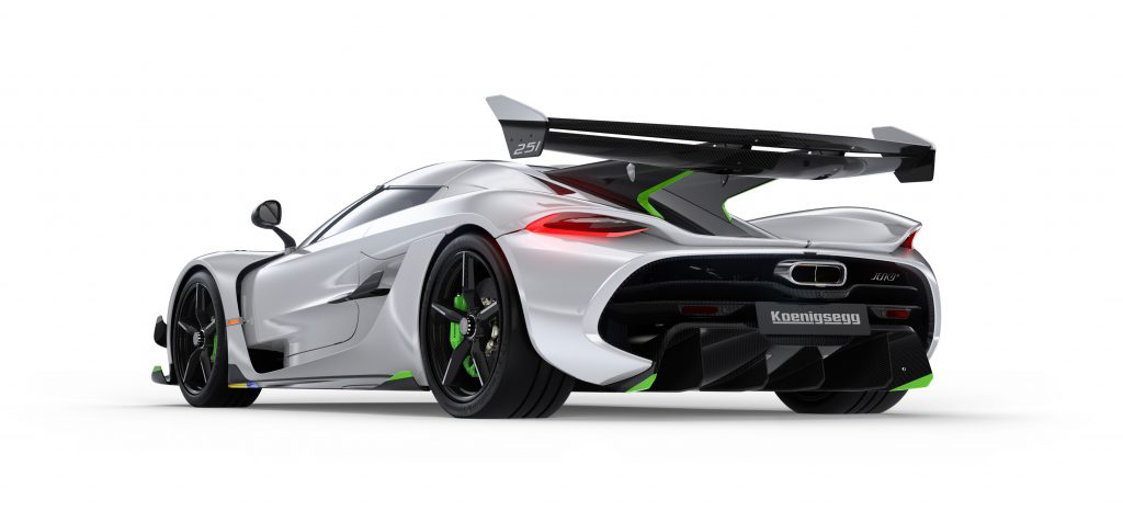 车身侧面,科尼赛克Jesko与科尼赛克Agera车型较为相似,圆弧形的车顶延伸至较长的车尾部分,同时新车还在侧面加入了更多的空气动力学配备。车尾部分设计更为圆润,硕大的尾翼连接至车顶后方的溜背部分,小尺寸的尾灯置于尾部翘起的扰流部件中,增添层次感。排气至于尾部格栅的中央,大尺寸的扩散器在其下方。