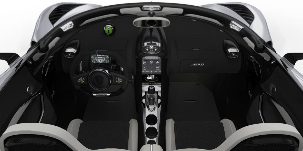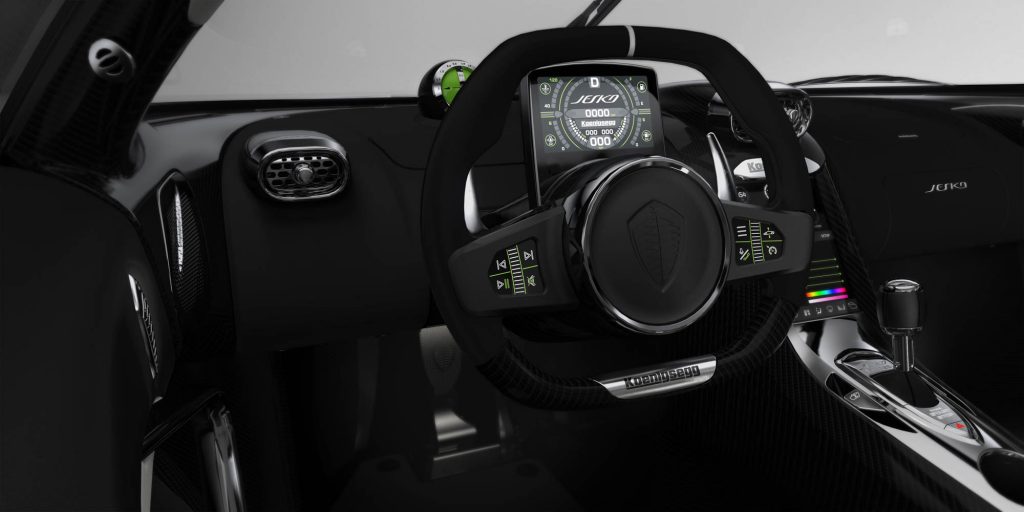 科尼赛克Jesko的内饰采用较为简约的设计,并将仪表盘更新为了全液晶式的设计。同时,还配备了9英寸的SmartCenter中控液晶屏,内置了多媒体控制、蓝牙连接、车辆模式控制等功能。