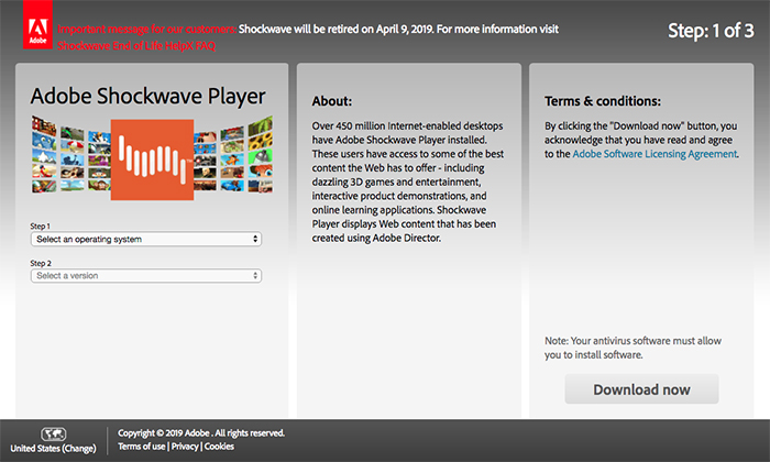 Adobe官方宣布,Adobe Shockwave将在4月9日正式退出历史舞台,Windows版本的Shockwave Player也不再提供官方下载,现有企业客户将继续支持到2022年,EULA用户则支持到一年合同期限结束。Shockwave是一个基于浏览器的多媒体平台,主要用于交互应用、视频游戏等,最初诞生于1995年,2005年随着Macromedia公司被收购而进入Adobe大家庭。Adobe表示,随着技术的进步、移动设备的普及,交互内容已经转向HTML5 Canvas、Web GL等新平台,Shockwave近年来使用率越来越低。
