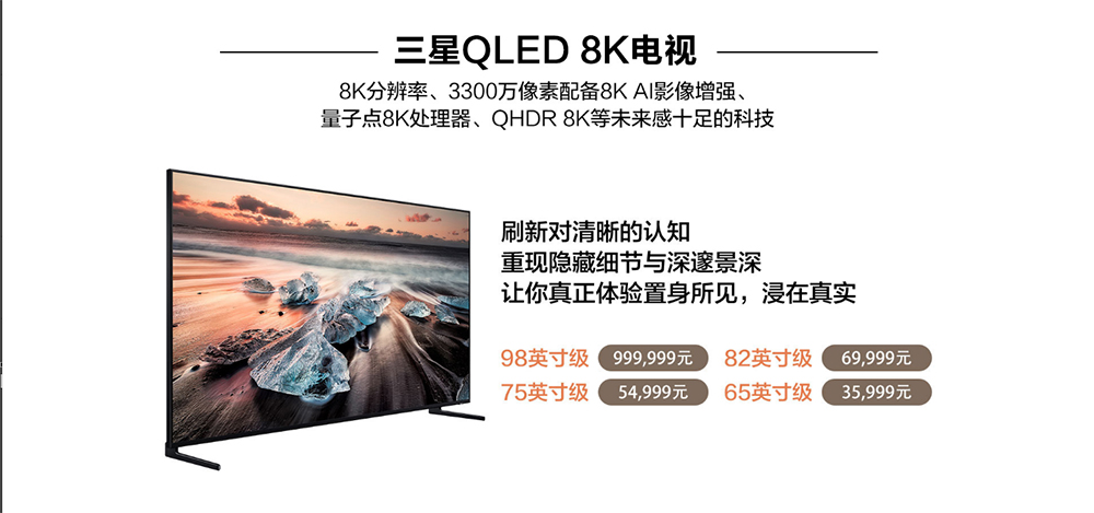 【小熊在线网 新闻报道】3月13日,三星中国举行新品发布会,正式发布了三星Q900系列QLED 8K电视。提供四款尺寸,分别为65英寸(35999元)、75英寸(54999元)、82英寸(69999元)和98英寸(999999元),其中,98英寸版本是三星有史以来最大的QLED电视。目前,三星Q900系列已经在中国官网接受预订。
