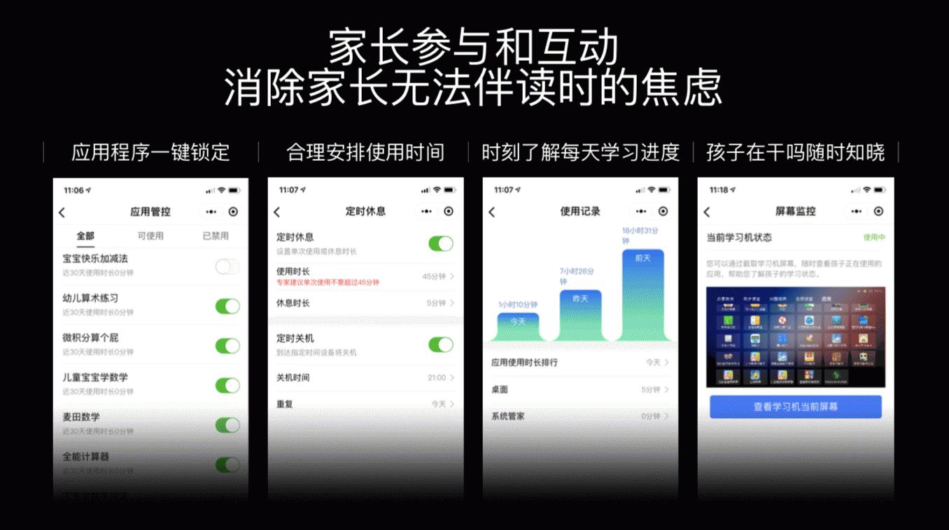 第二,家长可以参与和互动,消除家长无法伴读时的焦虑。通过手机,家长们可以进行应用程序一键锁定、合理安排使用时间、时刻了解每天学习进度、当前学习机状态显示,孩子在干嘛随时知晓,在防止沉迷的同时也可以进行远程配置、学习娱乐劳逸相结合。