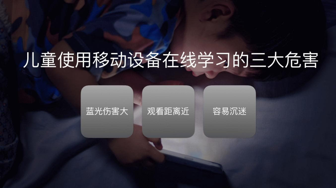 但不可忽视的一点是,目前儿童在线教育实际现状不容乐观,整个市场基本都在使用移动设备提供服务,存在屏幕小、非定制化产品、损伤视力、交互能力弱等问题。去年8月30日,教育部等八部门关于印发《综合防控儿童青少年近视实施方案》的通知,明确要求禁止手机、Pad等移动设备进入课堂。因为儿童使用移动设备在线学习具有蓝光伤害大、观看距离近、容易沉迷三大危害。所以,缺乏专业的在线教育智能硬件,成为市场亟需解决的难题。