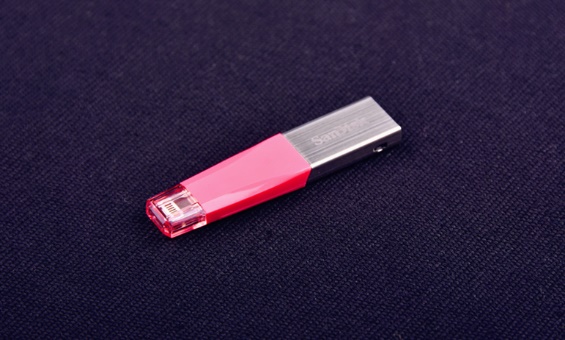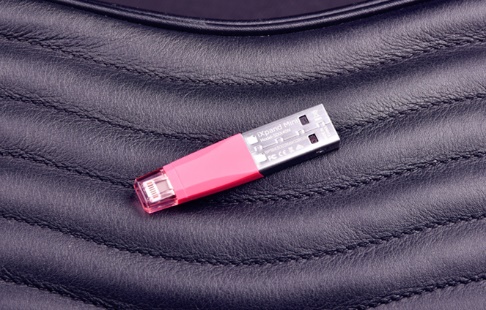 欣享苹果手机U盘十分简洁,整体呈细长造型,不锈钢金属和硬质橡胶一分为二,金属材质上刻有激光闪迪LOGO,下方连接手机的接口部分为黑色塑料材质,在两种材料的衔接处也没有明显的缝隙,手感非常顺滑。