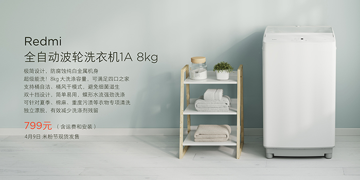 3月18日,Redmi在北京推出首款大家电——Redmi全自动波轮洗衣机1A(8kg),售价是799元,4月9日米粉节现货发售。拥有“极简设计、超级能洗、自清洁”三大功能。采用金属机身,可有效防腐蚀,通体白色,配合透明天窗设计。拥有8kg洗涤容量,可满足四口之家需求。支持桶自洁、捅风干模式,避免细菌滋生。还能针对夏季、棉麻、重度污渍等衣服进行专项清洗,独立漂脱可有效减少洗涤剂残留。