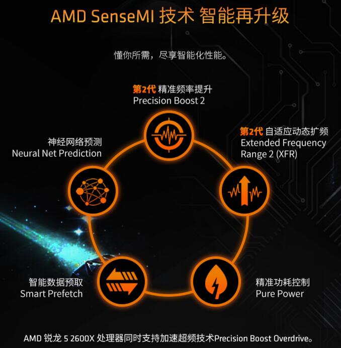 锐龙5 2600X处理器除了在性能参数上非常不错以外,在黑科技上也相当优秀,它搭载了全新的SenseMI技术,让用户在操作任何所需的应用场景及游戏时能更加智能化,在使用上更加方便,锐龙5 2600X的图形处理技术能让用户在高画质的游戏中尽情杀敌,流畅的画面能为用户带来炙热的手感,再加上非常人性化且智能化的SenseMI技术,不管用户是在主流游戏还是各种3A游戏大作上都可以尽情释放,同时还可以为用户带来无与伦比的操作体验,是一款值得用户购买的产品,让用户随时感受到AMD黑科技所带来的强大性能。