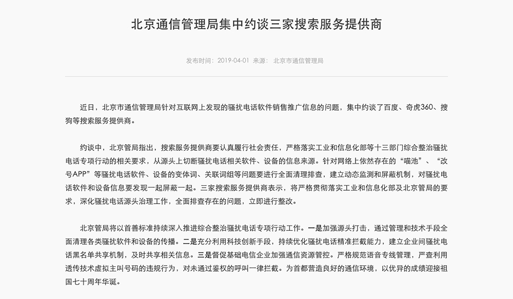 针对骚扰电话软件销售推广信息问题 北京通信管理局约谈搜索服务提供商