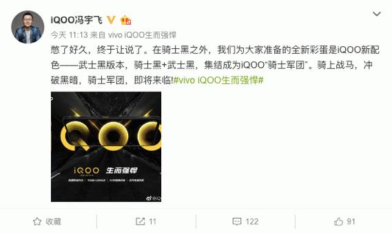 今日iQOO隐藏彩蛋终于揭开谜底,iQOO品牌副总裁冯宇飞再次更新微博,曝光了iQOO最新配色:“在骑士黑之外,我们为大家准备的全新彩蛋是iQOO新配色——武士黑版本,骑士黑+武士黑,集结成为iQOO‘骑士军团’。骑上战马,冲破黑暗,骑士军团,即将来临”。这意味着,即将购买 iQOO的用户除了可以买到电光蓝、熔岩橙、骑士黑三种配色之外,还有武士黑可供选择。