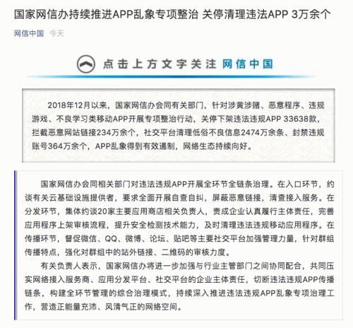【小熊在线网 新闻报道】据“网信中国”发布的消息,2018年12月以来,国家网信办会同有关部门,针对涉黄涉赌、恶意程序、违规游戏、不良学习类移动APP开展专项整治行动,关停下架违法违规APP 33638款,拦截恶意网站链接234万余个,社交平台清理低俗不良信息2474万余条、封禁违规账号364万余个,APP乱象得到有效遏制,网络生态持续向好。