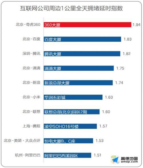 数据显示,奇虎360全天拥堵指数排名第一,排名第二名和第三名的分别是百度和腾讯,滴滴、新浪、小米、联想、携程、美团点评、阿里巴巴也均挤入前十。