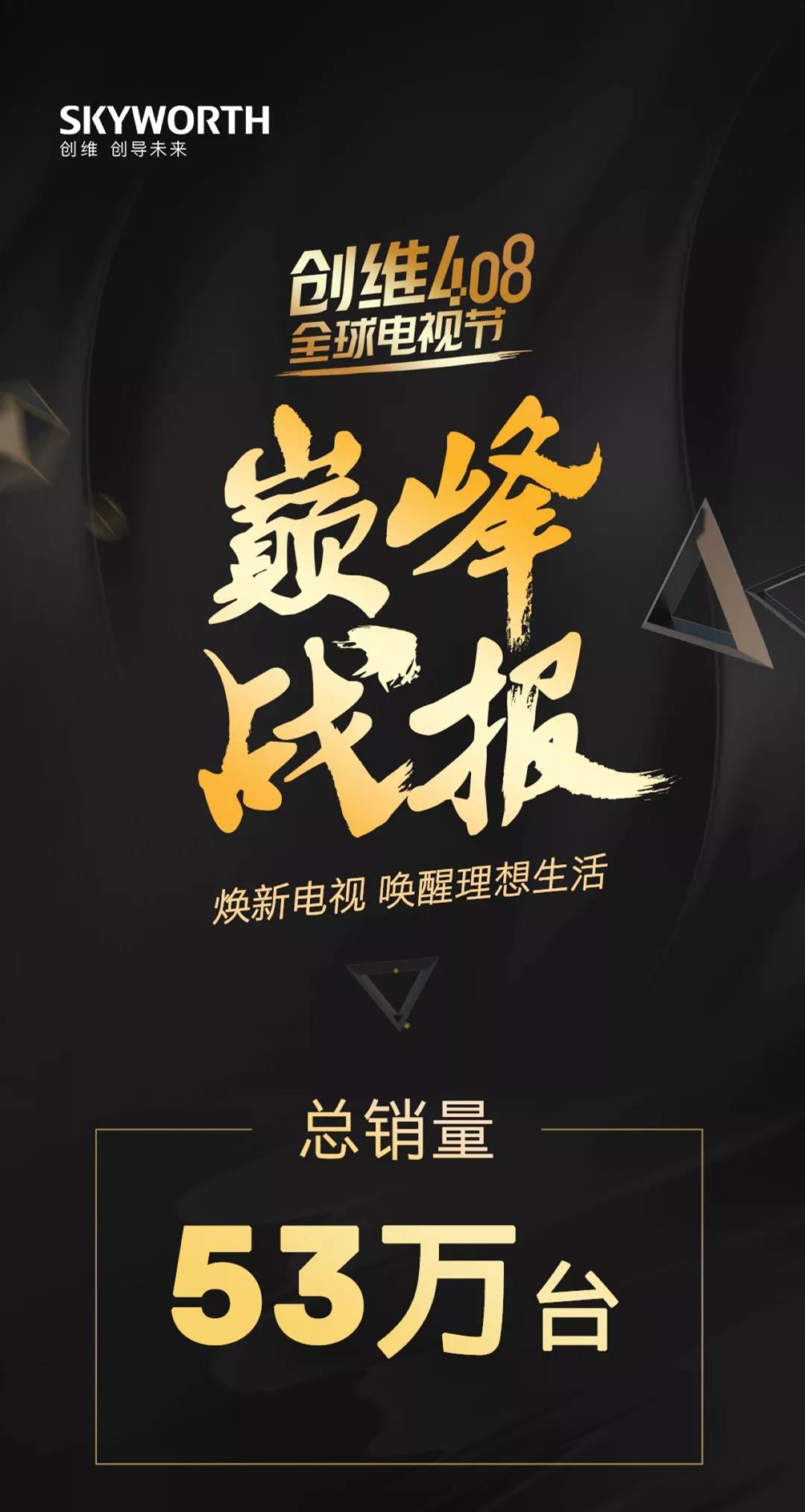 近期,创维启动了全球范围内的电视换新狂欢节——“408全球电视节”,短短六天全球总销量就已经达到53万,海内外销售额更是接近10亿元,极大促进了创维在全球市场的品牌建设和蓬勃发展。凭借自身的技术积累以及对未来趋势的精准判断,未来,创维力争持续引领彩电行业。