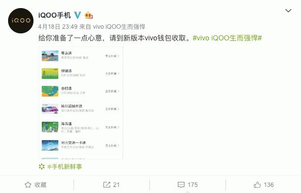 昨晚,iQOO官方微博发布消息称,vivo公交已经发布升级推送,此次升级将使得vivo公交再增加9张公交卡,其中包括武汉通、琴岛通、哈尔滨城市通、绿城通、合肥通、台州公共交通卡、江苏交通一卡通·南通、河北交通一卡通、海岛通。加上之前已经上线的京津冀互联互通卡、岭南通,vivo公交将支持多达11张公交卡,覆盖全国200余个城市。