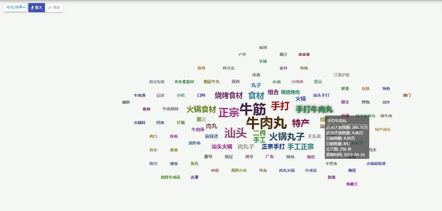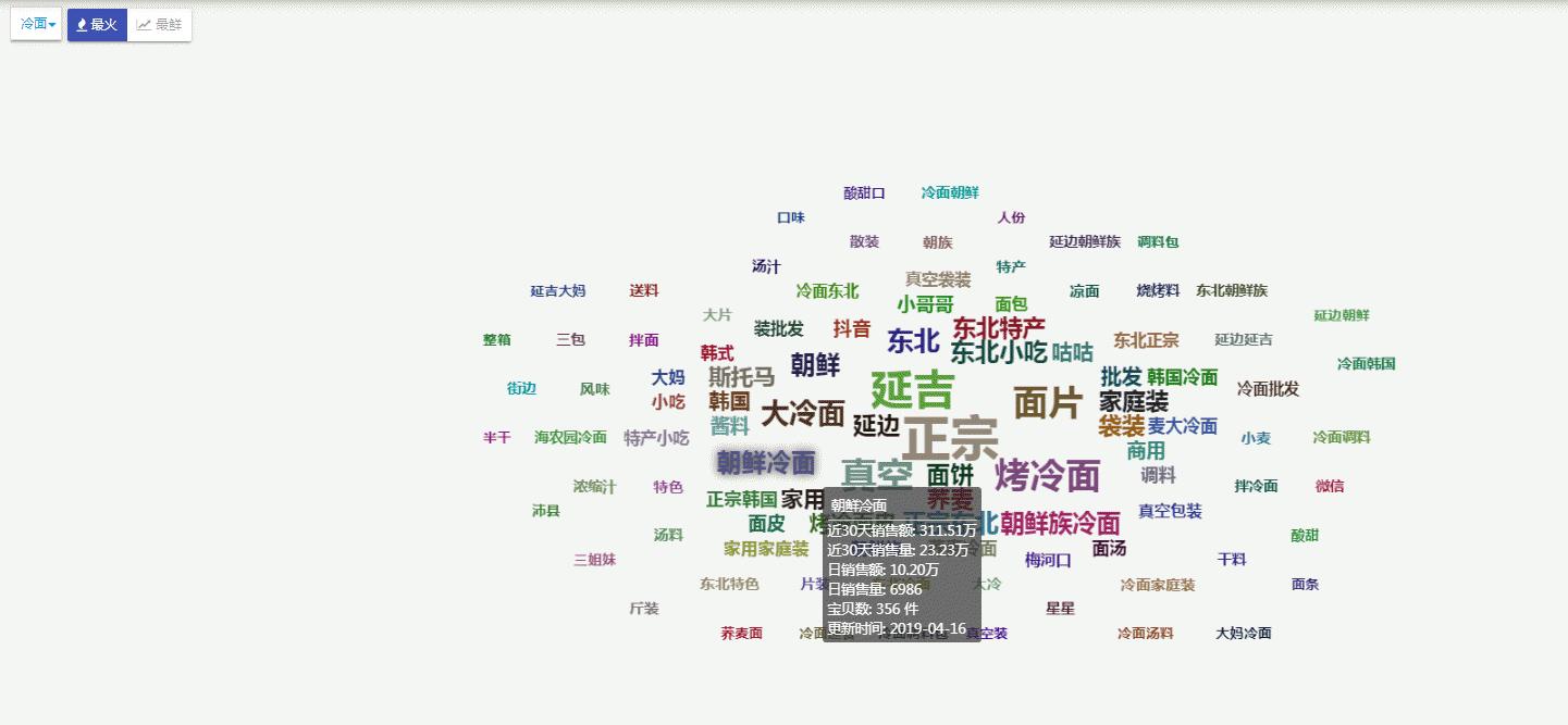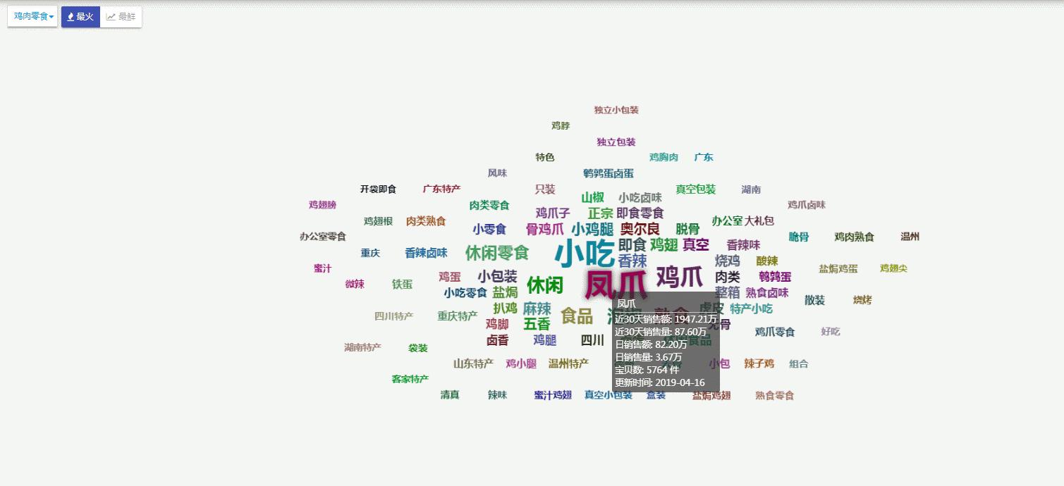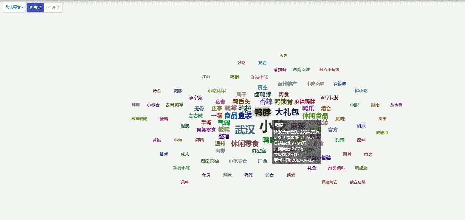 首先我们来看下,吃货地图中的这些美食在情报魔方后台--最鲜商机模块中销售额最大的热词有哪些。