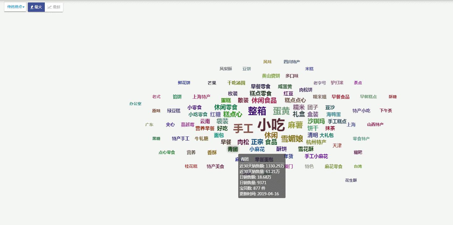 中国的传统糕点,历史悠久深入人心。在情报魔方最鲜商机中我们看到‘’糯米‘’、‘’麻花‘’、‘’青团‘’、‘’桂花糕‘’纷纷上榜大号字码,字码越大在最鲜商机中代表着销售额越高。