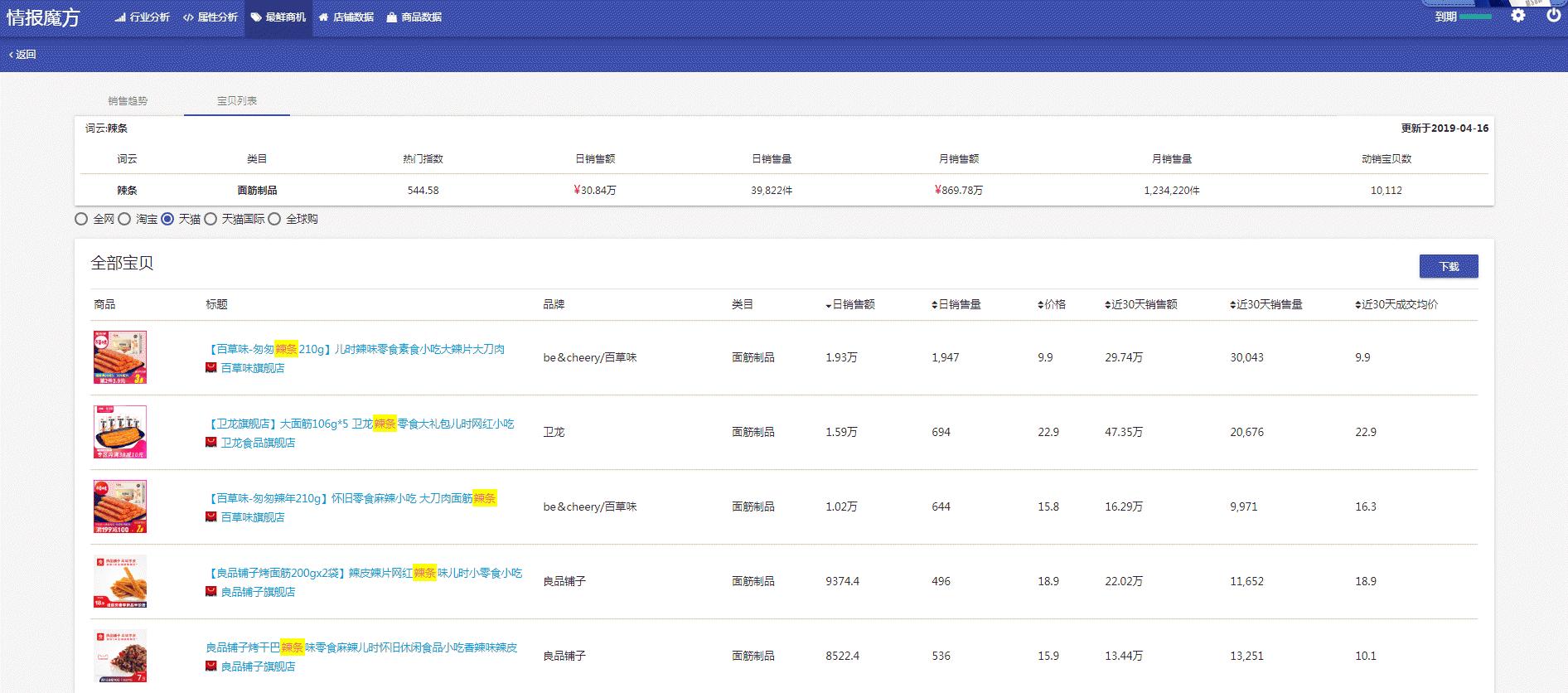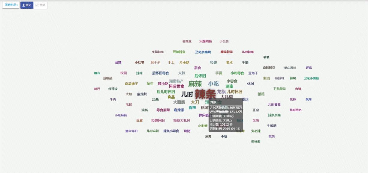 查看词云详细的销售数据,还包括了销售热门的宝贝列表,可以及时了解吃货们最近都爱吃什么口感的辣条。以便及时对新品进行开发,研究top商家热度高的产品属性,考验着商家供应商的响应速度,只有以最快的速度抓取热点产品,才能快速进入属性库,给店铺带来更多的流量曝光机会。