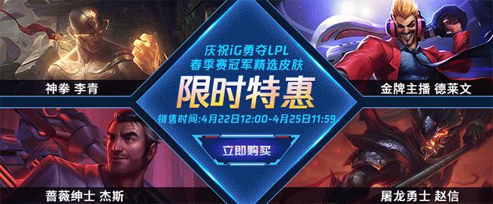 4月21日,LPL春季赛总决赛正式打响,IG以3:0比分战胜JDG获得首个联赛冠军奖杯。为了庆祝IG夺冠,《英雄联盟》官方推出了春季赛冠军精选皮肤显示优惠,优惠活动从4月22日中午12:00到4月25日中午11:59。这次的限时优惠包括了恶魔男爵瑞兹、神拳李青、金牌主播德莱文、弹幕天使卡莎等炫酷的皮肤,共19款,都是五折优惠,价格十分划算。