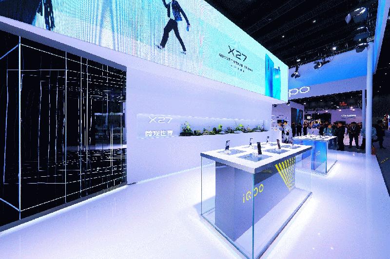 vivo展区内设置了5G空间、iQOO互动游戏体验区、光影隧道、X27微距之光四大互动体验区有,展出vivo NEX 5G样机以及正在热卖的iQOO手机、vivo X27时尚旗舰手机以及为政企用户提供的政企机型。
