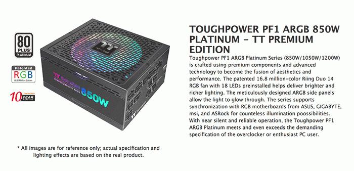 4月24日,Thermaltake(曜越科技)推出了一款全新的PC电源——Toughpower PF1 ARGB,按功率分有850W版本、1050W版本、1200W版本。搭载了一个140mm Riing Duo 14 RGB风扇,左右两侧配备RGB装饰,共有18个RGB LED灯。此外Toughpower PF1 ARGB通过了80 Plus白金认证,全DC-DC开关,保证转化效率,100%的日本电容,拥有过压、欠压、过载、过热和短路保护措施。采用完全模块化布线设计,三个型号都搭载了4+4针EPS电源接口、其中850W型号最多有6个6 + 2针PCIe电源接口、而1050W和1200W则提供8个。