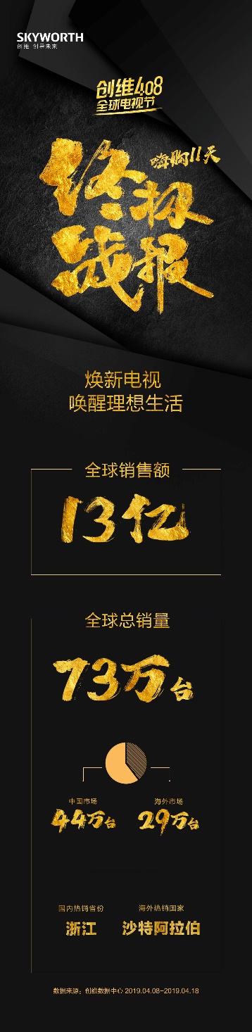 (2019年4月24日,深圳)4月18日24时,首届创维408全球电视节完美收官。在为期11天的电视“焕”机狂欢中,创维电视共斩获销量73万台,总销售额达13亿元。此次408全球电视节,创维电视联合天猫、京东、苏宁三大电商巨头,聚焦海内外市场,打通线上、线下销售渠道,旨在以最优惠的折扣价格回馈新老用户。根据数据显示,创维408全球电视节期间,国内销售量为44万台,海外销售量29万台,如此骄人的成绩为创维首次全球电视节画上完美句号。