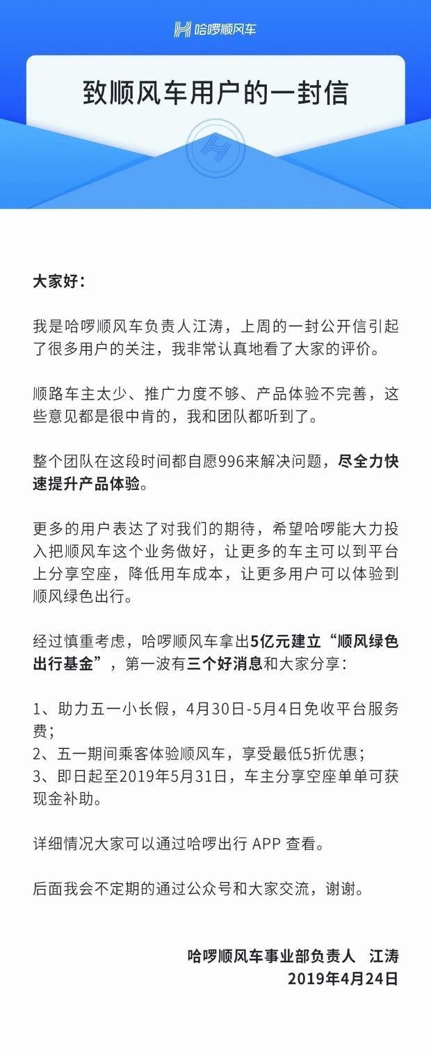 江涛表示,此次哈啰顺风车拿出5亿成立“顺风绿色出行基金”,从三个维度让车主和用户受益。第一,助力“五一”小长假,4月30日-5月4日免收平台服务费;第二,“五一”期间乘客体验顺风车,享受最低5折优惠;第三,即日起至2019年5月31日,车主分享空座单单可获现金补助。