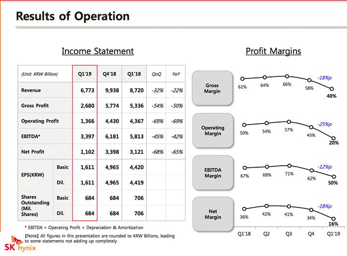 4月25日,SK海力士发布2019 Q1财报。2019第一季度SK海力士营收减少22%至6.77万亿韩元(约合人民币393亿元),营业利润减少69%至1.37万亿韩元(约合人民币79亿元),净利润减少64.7%至1.1万亿韩元(约合人民币63亿元),为该公司2012年来最大跌幅,获利也成为2016年来最大低谷。由于第一季度内存需求放缓且内存降价速度超预期,SK海力士第一季度营收与营业利润环比下降32%和69%,DRAM出货量环比下降8%,平均售价环比下降27%,NAND闪存平均售价下降32%,出货量环比下降6%。