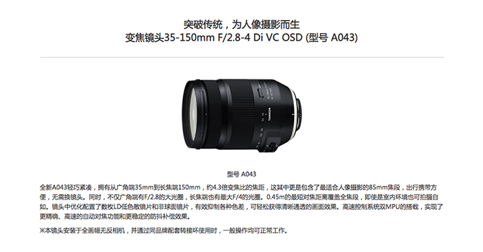 腾龙正式宣布全新镜头35-150mm F/2.8-4 Di VC OSD。尼康F卡口版本长124.3mm、重790g,5月23日上市;佳能EF卡口版本长126.8mm、重796g,6月20日上市。滤镜口径均为77mm,兼容腾龙多功能调焦器TAMRON TAP-in Console。该镜头由14组19片镜片组成,其中LD镜片、复合非球面镜片各有3片,镜片表面采用BBAR宽频抗反射镀膜,内部双MPU控制系统和OSD优化静音马达,在AF速度、静音性能和防抖效果上均有提升。35-150mm是变焦镜头中的全新焦段,能覆盖全身人像35mm、半身人像85mm及特写135mm三个经典的人像拍摄焦距,f/2.8-4光圈,使用非常灵活。