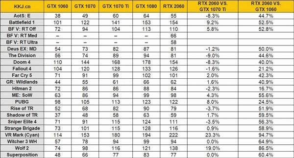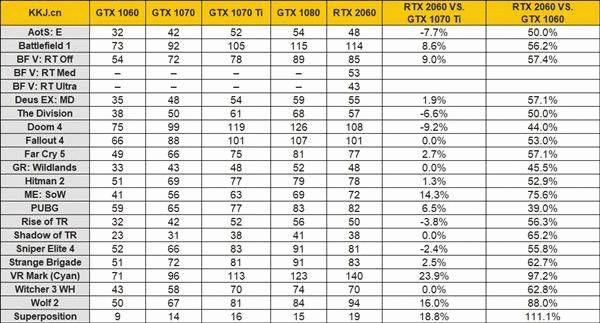 1080p分辨率下,RTX 2060游戏性能平均领先GTX 1070 Ti 1.9%,领先GTX 1060 50.9%,如果去掉差距较大的VR Mark话则是0.8%、48.6%。