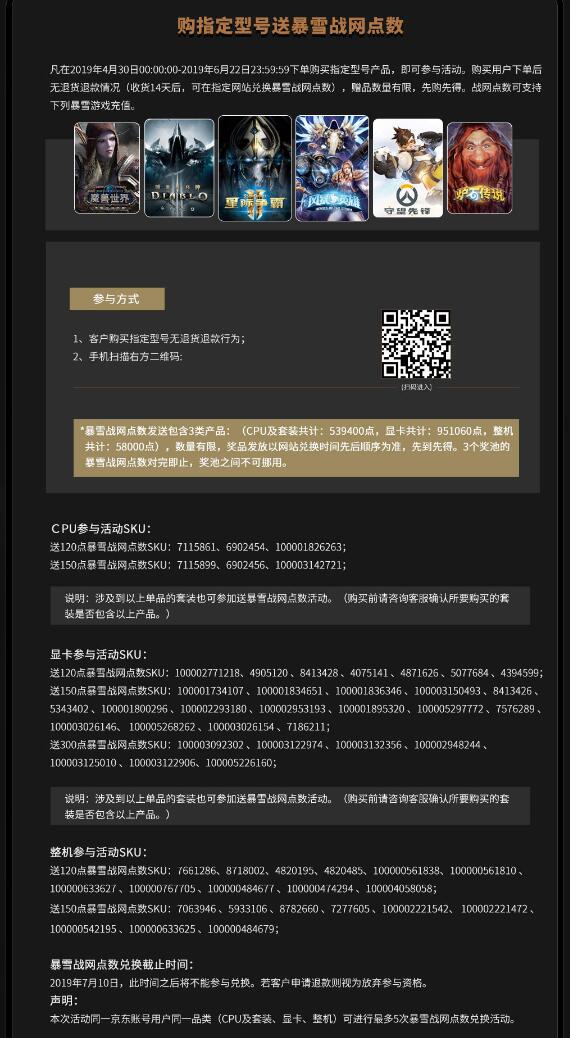 购指定型号产品立得暴雪战网点卡:凡是在活动期间内购买指定型号产品(CPU、显卡和整机产品)就送暴雪战网点卡,最高可获得价值300元的暴雪战网点卡