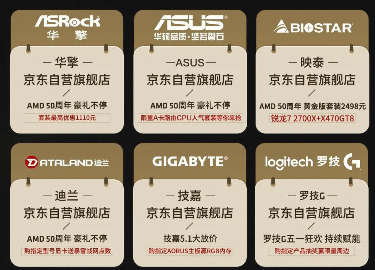 在本次活动中除了AMD锐龙7 2700X 50周年纪念版处理器和AMD Radeon VII 50周年纪念版 7nm 游戏显卡之外,AMD京东自营旗舰店和天猫AMD电脑硬件旗舰店中还加入了各大“DIY产业联盟”厂商旗舰店的50周年纪念版套包,后续活动中“DIY产业联盟”还会有更多惊喜促销等待着大家。