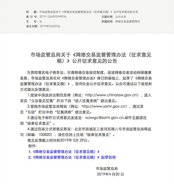 4月30日,国家市场监督管理总局发布了《市场监管总局关于<网络交易监督管理办法(征求意见稿)>公开征求意见的公告》。公告指出,为规范网络交易活动,维护网络交易秩序,保障各方主体合法权益,促进网络交易持续健康发展,依据《电子商务法》等有关法律、行政法规以及市场监督管理职责,制定本办法。其中,第二章第十五条规定:网络交易经营者应当全面、真实、准确、及时地披露商品或者服务信息,保障消费者知情权和选择权。网络交易经营者不得以虚构交易、编造用户评价、删除用户不利评价等方式进行虚假或者引人误解的商业宣传,欺骗、误导消费者。第二章第三十一条规定:网络交易平台经营者应当建立健全信用评价制度,公示信用评价规则,为消费者提供对平台内销售的商品或者提供的服务以及平台内经营者进行公开评价的途径。网络交易平台经营者不得删除消费者对平台内销售的商品或者提供的服务以及平台内经营者的评价。