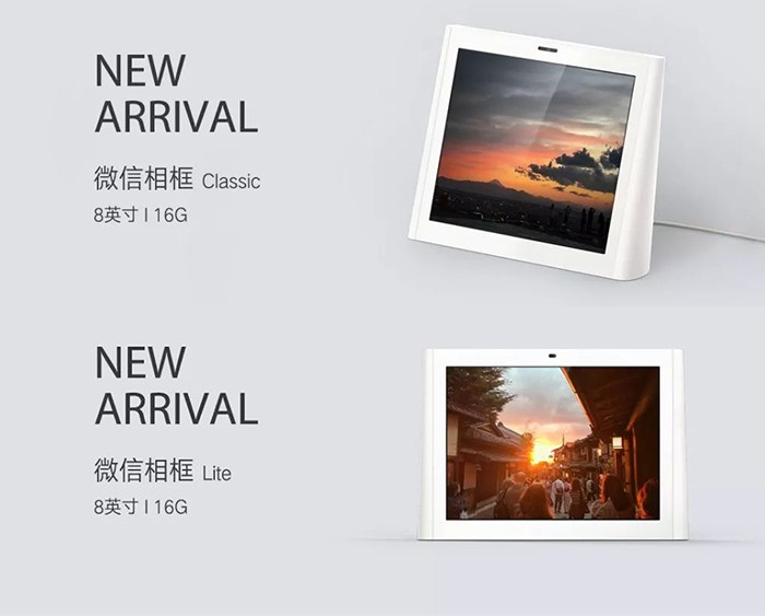 近日,微信相框Classic、微信相框Lite两款新品已正式登陆WeStore,分别售价799元、599元。微信相框Classic和Lite采用8寸IPS全视角720p高清屏幕,四核处理器,加载图片不卡顿,播放视频更流畅。内置4500mAh电池容量,拥有2~3小时续航能力,还支持智能光感调节以保护视力。可扫码连接微信相框,进入微信相框小程序即可发送图片或视频,加密存储照片,保护隐私安全,支持照片导出至手机,还能通过多人连接,建起亲友团。微信相框Classic支持可视频通话,微信相框Lite版不支持。