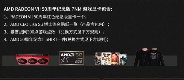 AMD Radeon VII 50周年纪念版显卡采用红黑金三色主色调设计,并有AMD丨50标识,极具收藏价值。此外,AMD Radeon VII 50周年纪念版显卡同样附赠周边赠品,包括暴雪战网300点游戏点数,AMD总裁兼首席执行官苏姿丰博士签名贴纸一张,以及一件50周年纪念T恤。此型号在京东独家售卖。