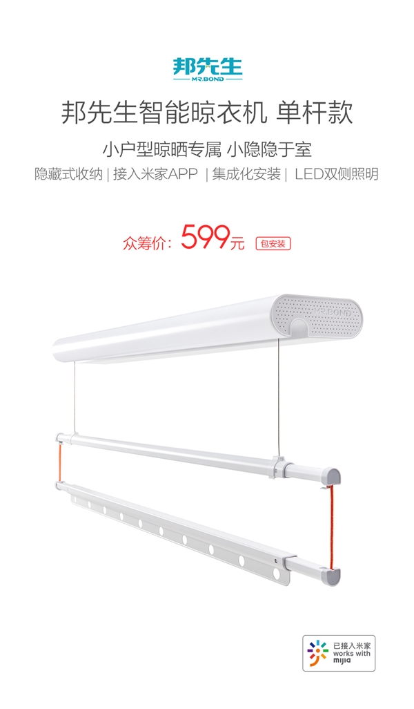 【小熊在线网 新闻报道】5月7日,小米众筹上架了一款邦先生智能晾衣机,支持隐藏式收纳,LED双侧照明,并已接入米家APP,众筹价599元。