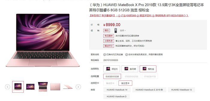 5月10日,新款华为MateBook X Pro樱粉金配色上市,目前仅有i5+8+512GB+独显配置,售价8999元。华为推出100元定金抵300元的促销活动,到手价8799元,花呗、掌上生活、工行、农行可以免息分期。MateBook X Pro采用13.9英寸无边触控屏,屏幕分辨率为3000*2000,像素密度达到了260PPI,屏幕比例为3:2,100% sRGB色域,屏占比达到了91%。搭载英特尔第八代酷睿 i5-8265U 处理器(另有i7版本可选),同时配备NVIDIA GeForce MX250独立显卡(另有集显版本可选)。整体采用超薄机身设计,最薄处仅14.6 mm,配备电源/指纹解锁二合一开机键与杜比全景声音响系统,还提供隐藏式摄像头、USB接口和雷电3接口。