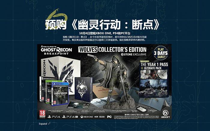 5月10日,育碧游戏官方微博正式公布全新3A大作《幽灵行动:断点》的CG宣传片,并开放预购。《幽灵行动:断点》的故事背景则是设定在一个神秘之地——极光岛。在这个拥有雪山,熔岩,荒漠和丛林等种类繁多的陌生环境中,将与敌对势力展开一场军事对抗。在本作中强化了生存要素,增加了体力槽设定,一旦体力耗尽就会出现各种意外情况,此外强化了潜行系统,并提供了剧情分支选项,玩家的选择也会直接影响到接下来的游戏内容。该作将于2019年10月4日正式发布,登陆Xbox One(包括Xbox One X)、PS4以及PC平台,参加预购的用户可以注册BETA测试,提前抵达“极光岛”。